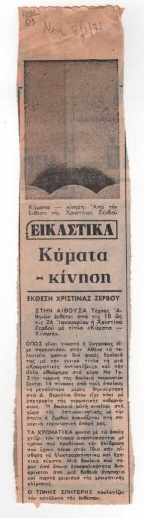 Απόκομμα εφημερίδας, χαρτί, 23,5×5,5 εκ., στα ελληνικά. Παρουσίαση της ατομικής έκθεσης της Χριστίνας Ζερβού στην Αθήνα, το 1977. Τον κατάλογο της έκθεσης προλόγισε ο Τώνης Σπητέρης. Εικονογραφείται με αναπαραγωγή έργου. Στο πάνω μέρος του αποκόμματος επιγραφή.