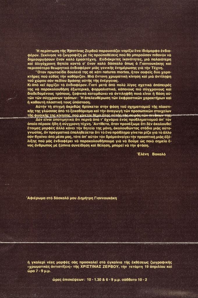Αφίσα και πρόσκληση της έκθεσης ζωγραφικής της Χριστίνας Ζερβού στην Αθήνα. Περιέχει κριτική της Ελένης Βακαλό.