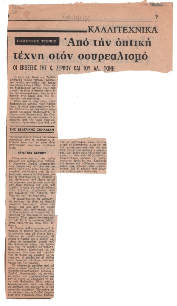 Απόκομμα εφημερίδας, χαρτί, 29,0×16,5 εκ., στα ελληνικά. Αναφορά στην ατομική έκθεση της Χριστίνας Ζερβού στην Αθήνα το 1977. Το τμήμα που αναφέρεται στην έκθεση του Αλ. Γκίνη έχει αφαιρεθεί κατά την αποδελτίωση.