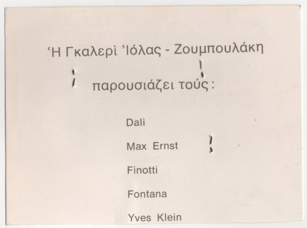 Απόκομμα, έντυπο, χαρτόνι, 9,0×12,2 εκ., στα ελληνικά. Πρόσκληση της ομαδικής έκθεσης καλλιτεχνών στην Γκαλερί Ιόλας-Ζουμπουλάκη. Παρουσιάζονται έργα των: Dali, Max Erns, Finotti, Fontana, Yves Klein. Στην πίσω όψη βρέθηκε συρραμμένο απόκομμα όπου παρουσιάζεται ατομική έκθεσης της ζωγράφου Χριστίνας Ζερβού.