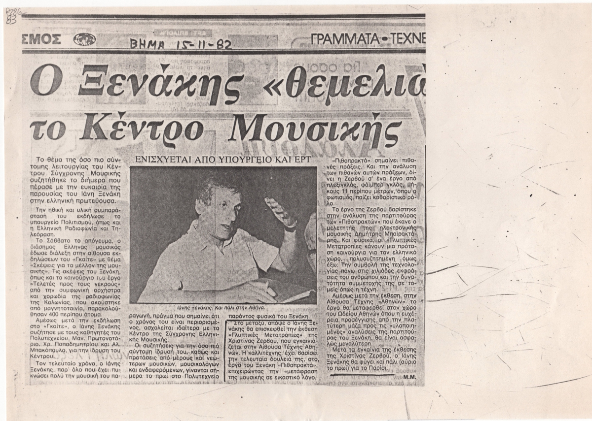 Φωτοαντίγραφο αποκόμματος εφημερίδας, χαρτ;i, 21,0×29,7 εκ., στα ελληνικά. Το δημοσίευμα αναφέρεται στην επίσκεψη του Ιάνη Ξενάκη στην Αθήνα το 1982 με θέμα τη επικείμενη λειτουργία του Κέντρου Σύγχρονης Μουσικής. Με την ευκαιρία ο συνθέτης έδωσε διάλεξη στο Ινστιτούτο Γκαίτε με θέμα “Σκέψεις για το μέλλον της μουσικής”, όπου παρουσιάστηκε το τελευταίο του έργο “Τελετές προς τους νεκρούς”. Επίσης αναφέρεται στην επικείμενη επίσκεψη του συνθέτη στην έκθεση της Χριστίνας Ζερβού στην Αθήνα όπου επιχειρείται η μετάφραση της μουσικής σε εικαστικό λόγο. Το άρθρο εικονογραφείται με αναπαραγωγή φωτογραφίας του συνθέτη. Πάνω από τον τίτλο επιγραφή.