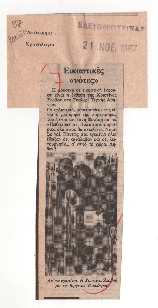 Απόκομμα εφημερίδας, χαρτί, 17,0×5,0 εκ., στα ελληνικά. Αναφορά στην έκθεση της Χριστίνας Ζερβού στην Αθήνα το 1982. Εικονογραφείται με αναπαραγωγή έργων. Στο πάνω μέρος επικολλημένο απόκομμα με τα στοιχεία του δημοσιεύματος.