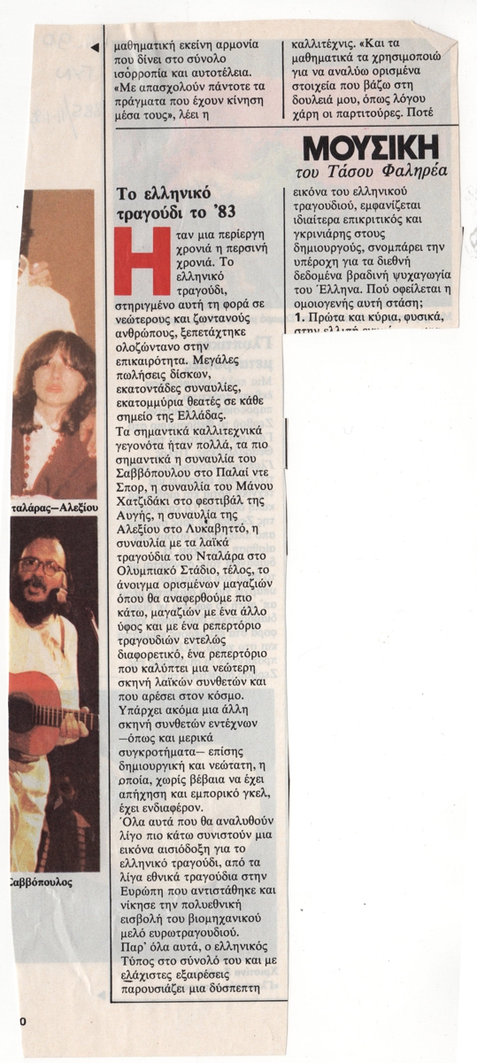 Απόκομμα περιοδικού, χαρτί ιλουστρασιόν, 26,5×11,0 εκ., στα ελληνικά. Απόσπασμα άρθρου του Τάσου Φαληρέα για την κατάσταση του ελληνικού τραγουδιού το 1983.