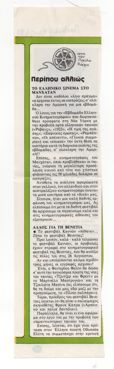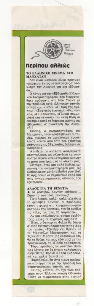 Απόκομμα περιοδικού, χαρτί ιλουστρασιόν, 29,0×7,5 εκ., στα ελληνικά. Το δημοσίευμα του Παύλου Κάγιου αφορά την “Εβδομάδα Ελληνικού Κινηματογράφου” στη Νέα Υόρκη με την προβολή επτά ελληνικών ταινιών. Στο ίδιο απόκομμα δημοσίευμα για το Φεστιβάλ Βενετίας.