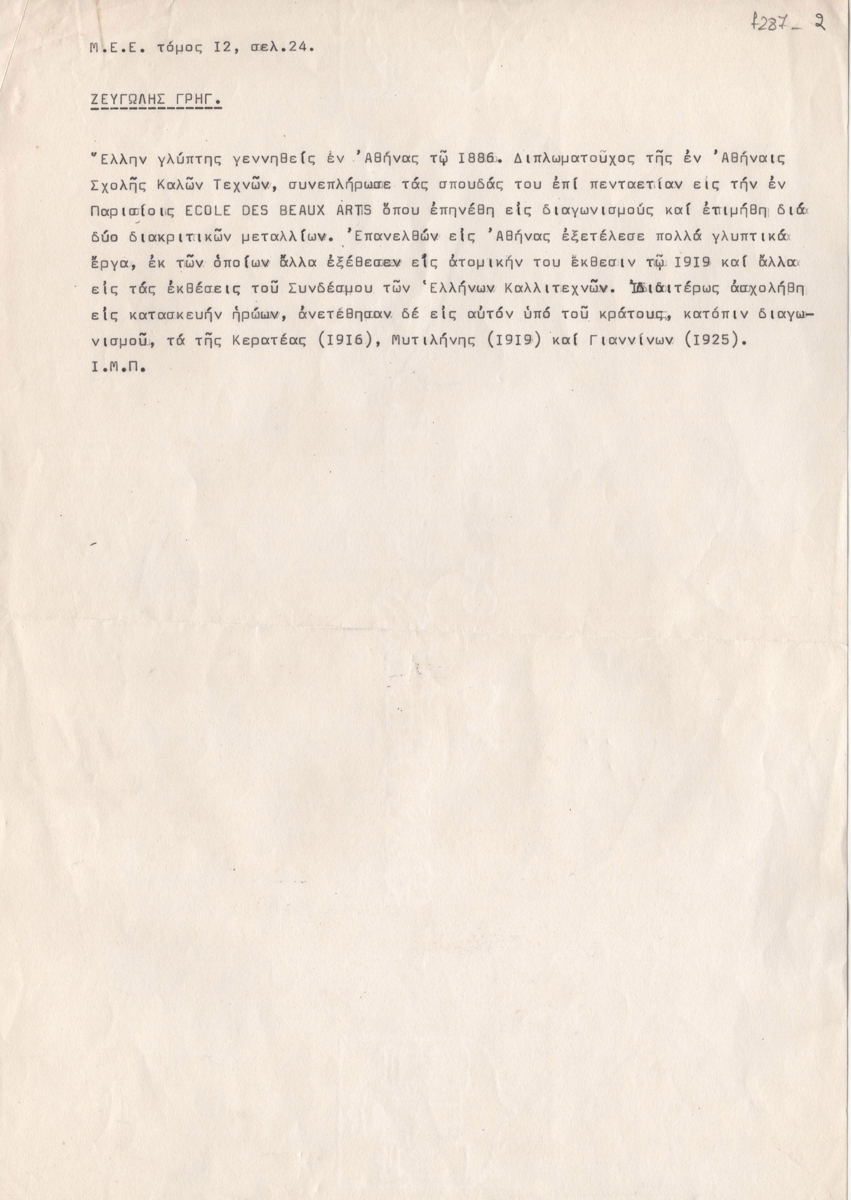 Κείμενο, δακτυλόγραφο, σε χαρτί, 29,8×21,0 εκ., στα ελληνικά. Σύντομο βιογραφικό σημείωμα του γλύπτη Γρηγόρη Ζευγώλη.
