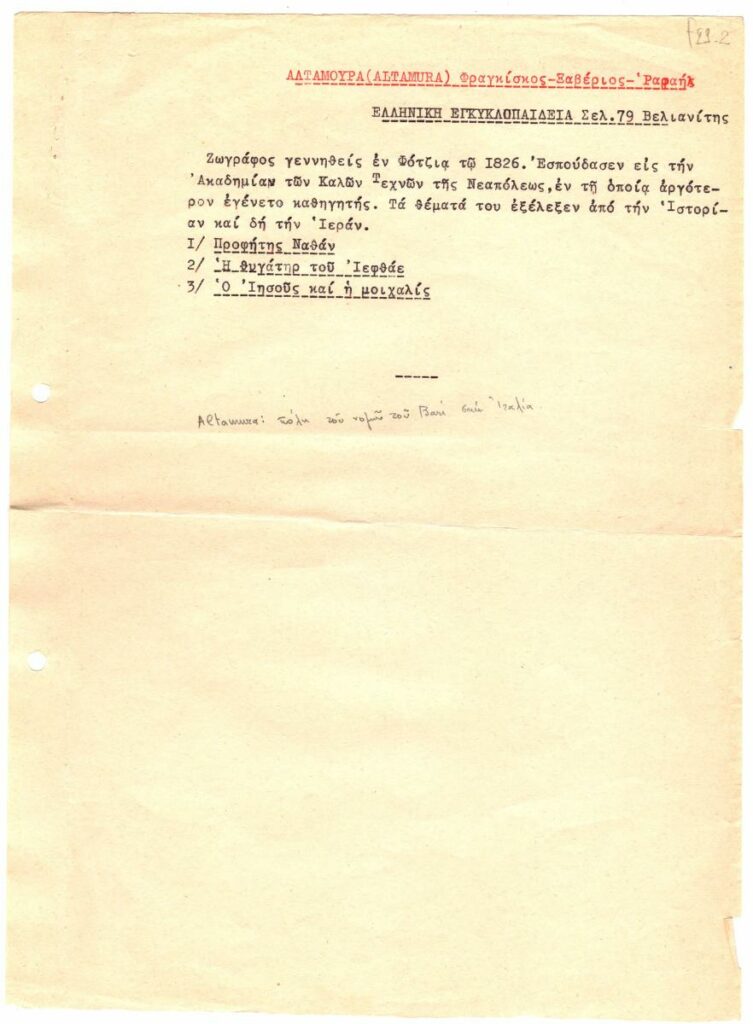 Αποδελτίωση λήμματος, δακτυλόγραφο, χαρτί, 30×20εκ, στα ελληνικά, για τον Φραγκίσκο-Ξαβέριο-Ραφαήλ Αλταμούρα, από δημοσίευση στην “Ελληνική Εγκυκλοπαίδεια”.