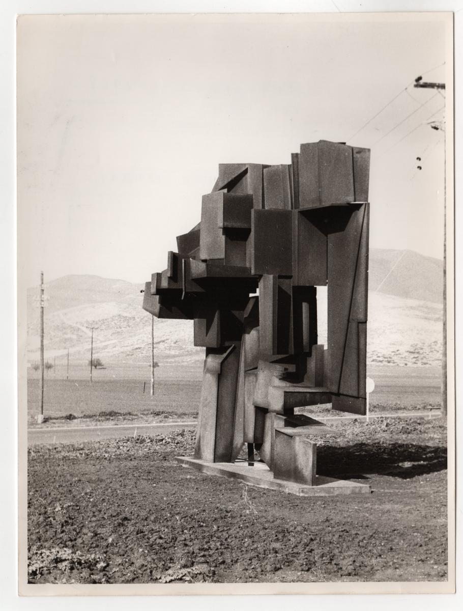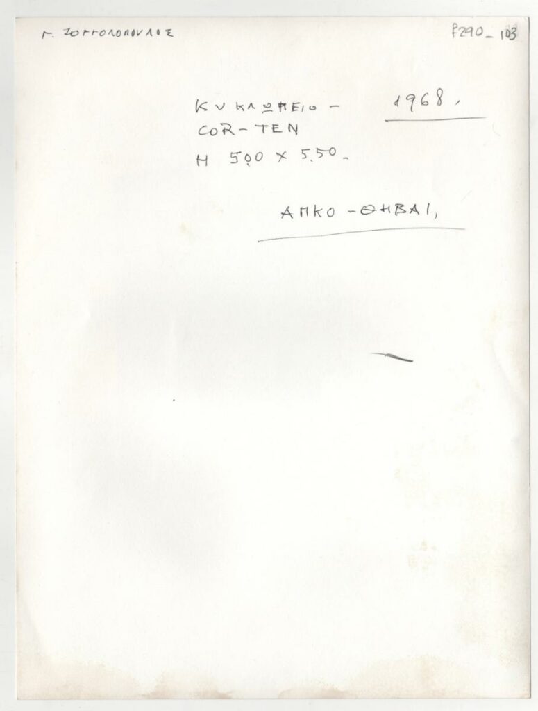 Ασπρόμαυρη εκτυπωμένη φωτογραφία έργου του Γιώργου Ζογγολόπουλου. Στην πίσω όψη, επιγραφές.