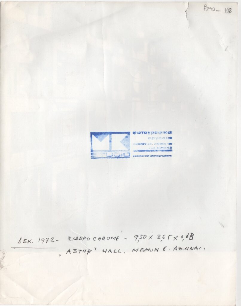 Φωτογραφία έργου του Γιώργου Ζογγολόπουλου, α/μ, σε φωτογραφικό χαρτί, 25,8×20,0 εκ. Το γλυπτό είναι τοποθετημένο στα γραφεία της ασφαλιστικής εταιρείας ASTΙΡ στην Αθήνα. Στην πίσω όψη επιγραφή και σφραγίδα φωτογράφου.