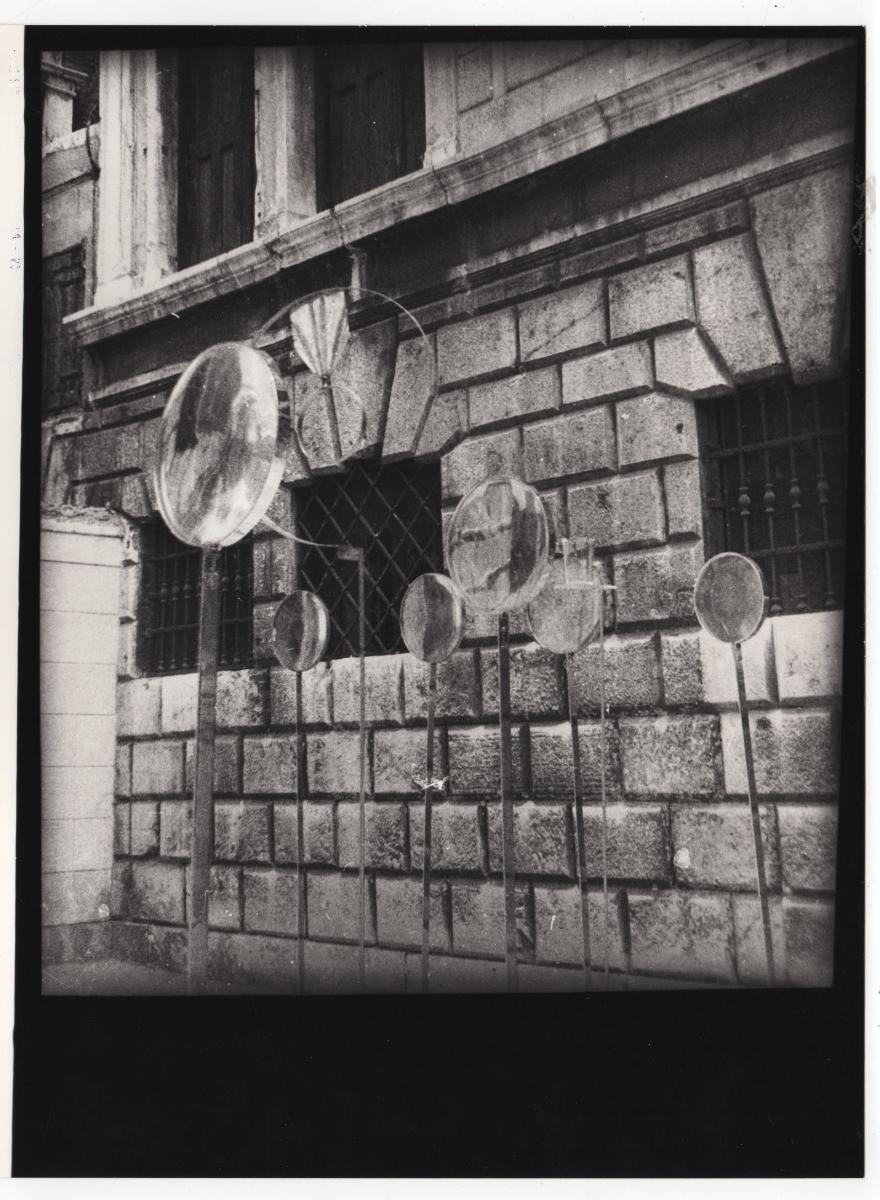 Ασπρόμαυρη εκτυπωμένη φωτογραφία έργου του Γιώργου Ζογγολόπουλου. Στην πίσω όψη, επιγραφές, σύμφωνα με τις οποίες το έργο παρουσιάστηκε σε έκθεση έργων του καλλιτέχνη στη Βενετία το 1976.