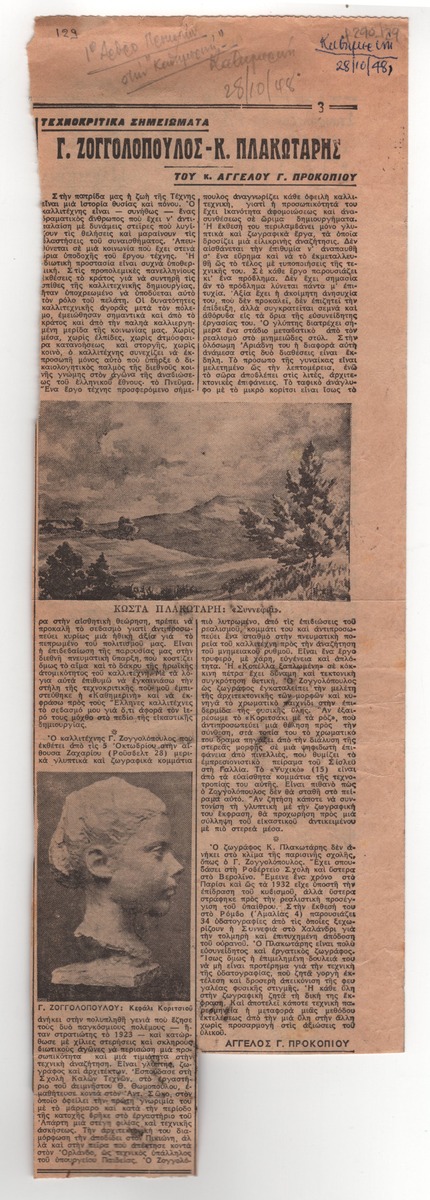 Απόκομμα της εφημερίδας “Η Καθημερινή” (28/10/1948). Κριτική δύο παράλληλων ατομικών εκθέσεων του Γ. Ζογγολόπουλου και του Κ. Πλακωτάρη στην Αθήνα.