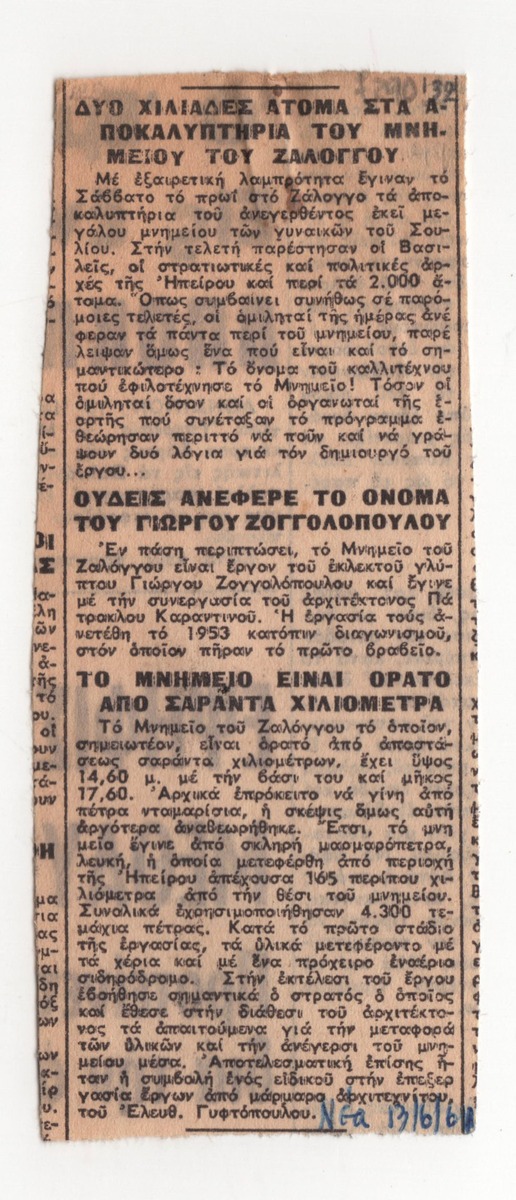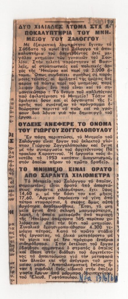 Απόκομμα της εφημερίδας “Τα Νέα” (13/06/1961). Δημοσίευμα σχετικά με τα αποκαλυπτήρια του Μνημείου του Ζαλόγγου που φιλοτέχνησε ο Γιώργος Ζογγολόπουλος σε συνεργασία με τον Πάτροκλο Καραντινό.
