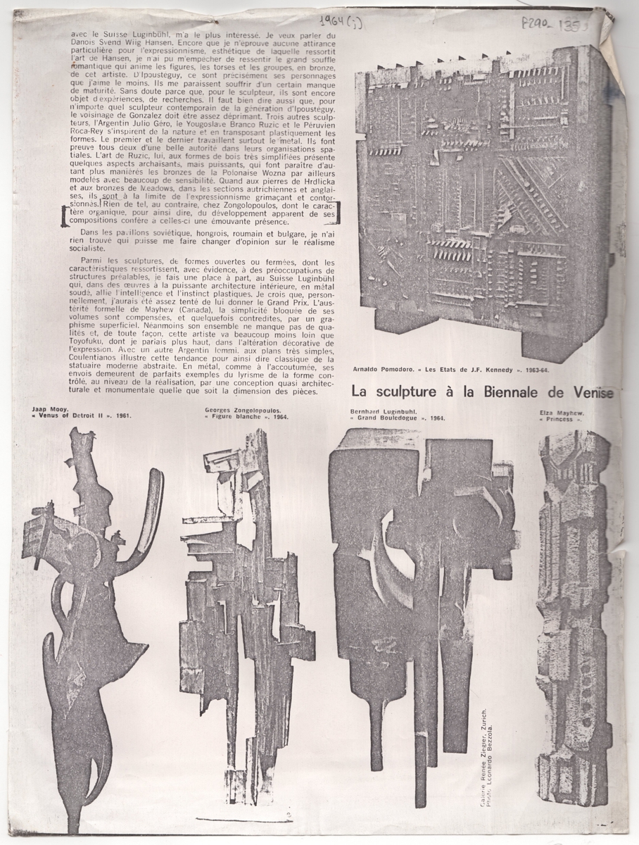 Φωτοαντίγραφο αποκόμματος εντύπου, χαρτί, 31,0×23,0 εκ. Δημοσίευμα, στα ιταλικά, σχετικά με την παρουσία της γλυπτική στην Biennale της Βενετίας το 1964. Εικονογραφείται με αναπαραγωγές έργων.