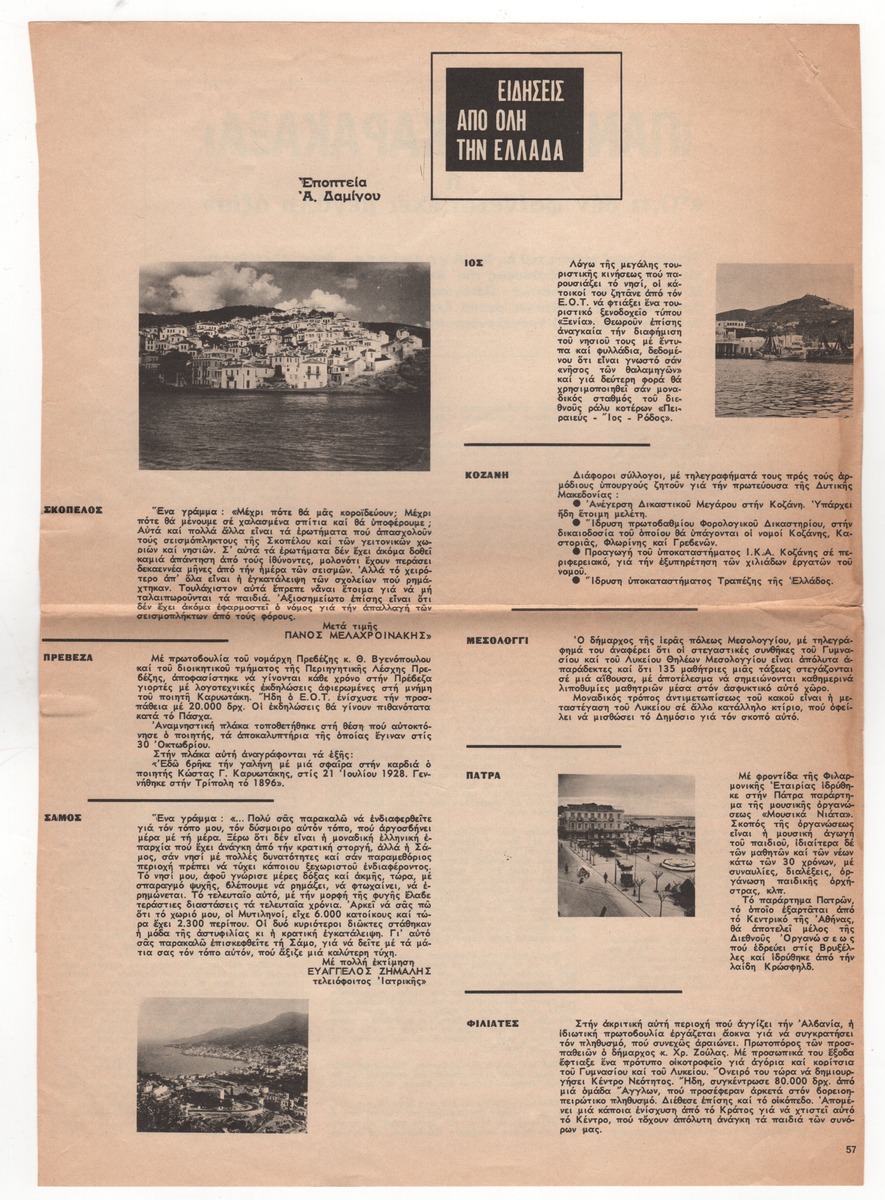 Απόκομμα του περιοδικού “Ο Ταχυδρόμος” (12/11/1966). Σύντομα θέματα από τη Σκόπελο, την Πρέβεζα, τη Σάμο, την Ίο, την Κοζάνη, το Μεσολόγγι, την Πάτρα και τους Φιλιάτες.