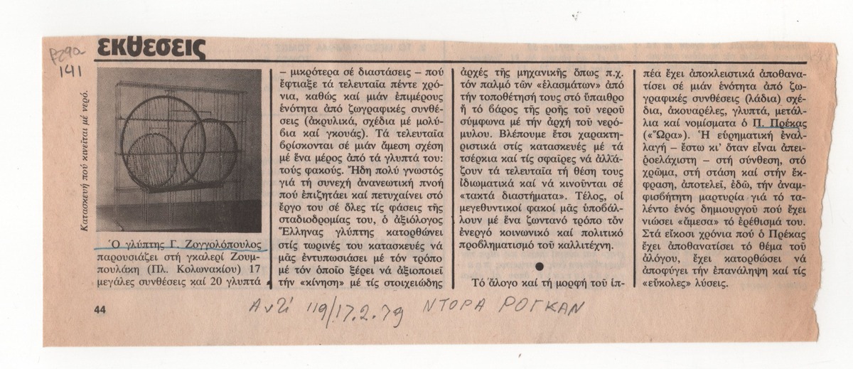Απόκομμα του περιοδικού “Αντί” (17/02/1979). Παρουσίαση των εκθέσεων του Γ. Ζογγολόπουλου και του Πάρι Πρέκα στην Αθήνα.