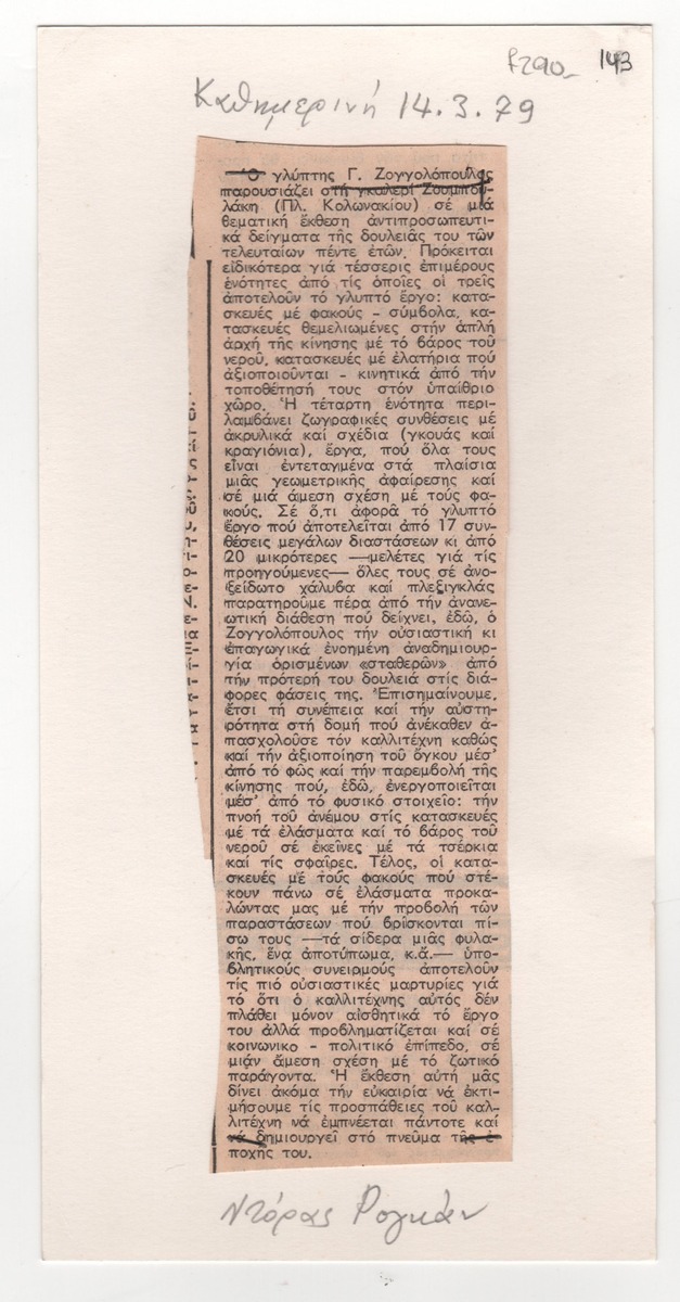 Απόκομμα της εφημερίδας “Η Καθημερινή” (14/03/1979), όπου δημοσιεύεται κριτική της Ντόρας Ηλιοπούλου-Ρογκάν για την έκθεση του Γ. Ζογγολόπουλου στην Αθήνα.