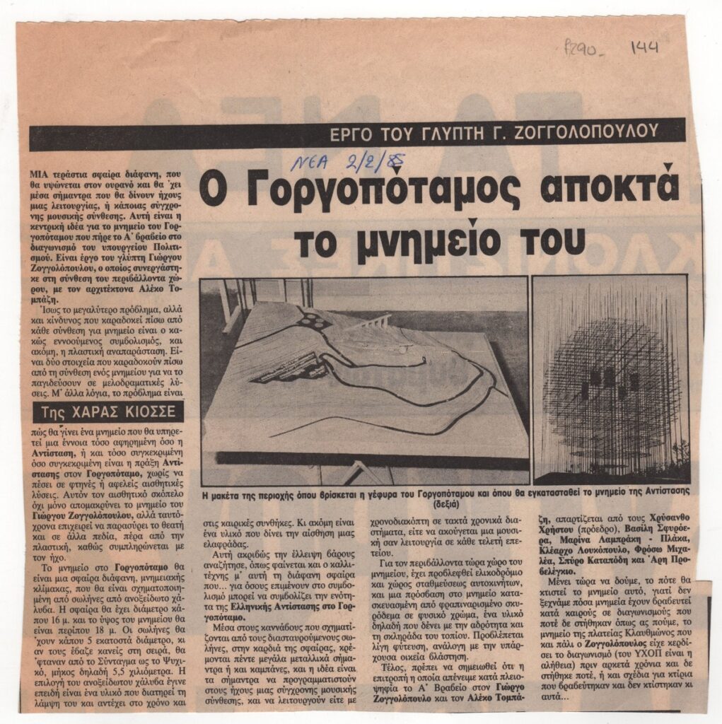 Απόκομμα της εφημερίδας “Τα Νέα” (08/02/1985). Δημοσίευμα σχετικά με την έκθεση με τις μακέτες και τα προπλάσματα που φιλοτέχνησαν οκτώ γλύπτες για τον διαγωνισμό του μνημείου της Εθνικής Αντίστασης για το Γοργοπόταμο, στον οποίο το πρώτο βραβείο κέρδισαν οι Γ. Ζογγολόπουλος και Αλ. Τομπάζης.