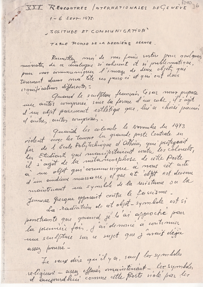 Φωτογραντίγραφο κειμένου, χειρόγραφου, στα γαλλικά, χαρτί, 2 φφ., 29,5×21,0 εκ. Κείμενο του καλλιτέχνη γραμμένο για την τελευταία συνεδρία της XXV Rencontres Internationales με θέμα Solitude et Communication που πραγματοποιήθηκε στη Γενεύη το Σεπτέμβριο του 1975.