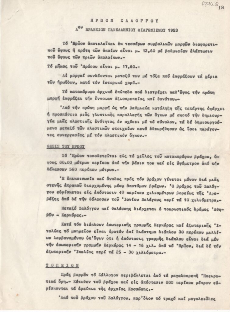 Κείμενο, δακτυλόγραφο, στα ελληνικά, σε χαρτί, 3 φφ, 28,7×21,3 εκ. Κείμενο για το Ηρώον του Ζαλόγγου, στο οποίο απονεμήθηκε το 1ο βραβείο πανελήνιου διαγωνισμού το 1953. Περιγράφεται το γλυπτό, η θέση, το τοπείο, ο τρόπος της τεχνικής εφαρμογής και τα υλικά. Το κείμενο έχει γραφεί τον Απρίλιο του 1960, ενώ ως χρόνος περάτωσης αναφέρετα το καλοκαίρι του ίδιου χρόνου.