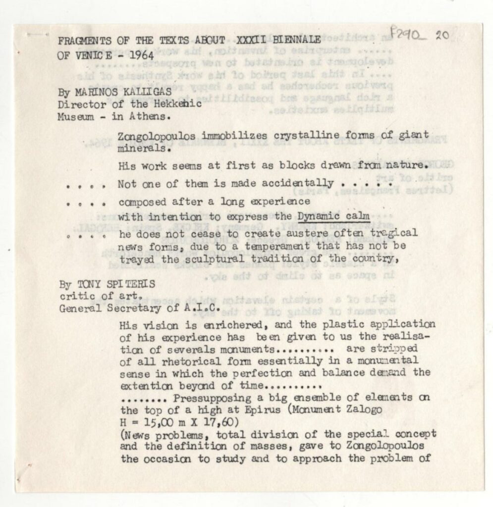 Δακτυλόγραφο κείμενο με αποσπάσματα κριτικών για τον Γιώργο Ζογγολόπουλο.