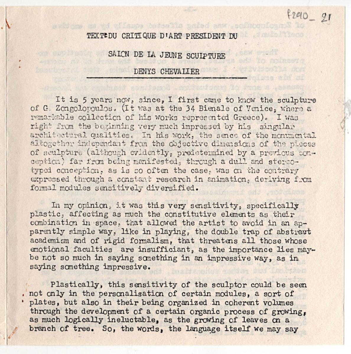 Δακτυλόγραφο κείμενο κριτικής του Denys Chevalier (President du Salon de la jeune sculpture) για το έργο του Γιώργου Ζογγολόπουλου.