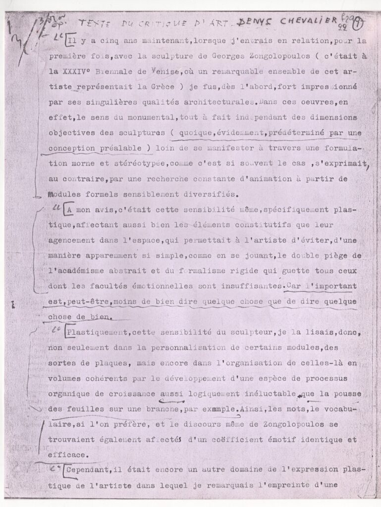 Κείμενο, δακτυλόγραφο, με χειρόγραφες σημειώσεις και διορθώσεις, στα γαλλικά, σε χαρτί, 7 φφ, 27,2×21,0 εκ. Κριτική του ιστορικού τέχνης Denys Chevalier για το έργο του Γιώργου Ζογγολόπουλου. Το κείμενο έχει γραφεί στο Ile de Sein.
