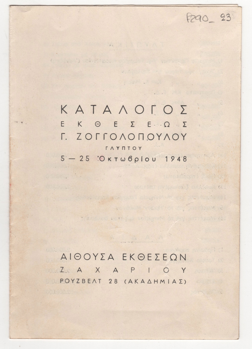 Έντυπο, δίπτυχο, χαρτί, 16,7×11,5 εκ., στα ελληνικά. Τιμοκατάλογος της ατομικής έκθεσης του Γιώργου Ζογγολόπουλου με γλυπτά, λάδια, ακουαρέλλες και παστέλ στην Αθήνα το 1948.