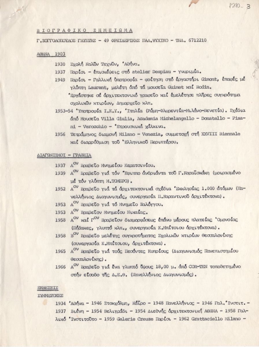 Κείμενο, δακτυλόγραφο με συμπληρώσεις, χειρόγραφες, με μπλε μελάνι, χαρτί, 3 φφ, 28,6×21,5 εκ., στα ελληνικά. Βιογραφικό σημείωμα του Γιώργου Ζογγολόπουλου οργανωμένο χρονολογικά. Αναφέρονται σπουδές, βραβεία σε διαγωνισμούς, ατομικές και ομαδικές εκθέσεις, έργα σε συλλογές, κριτικές και δημόσιες θέσεις.