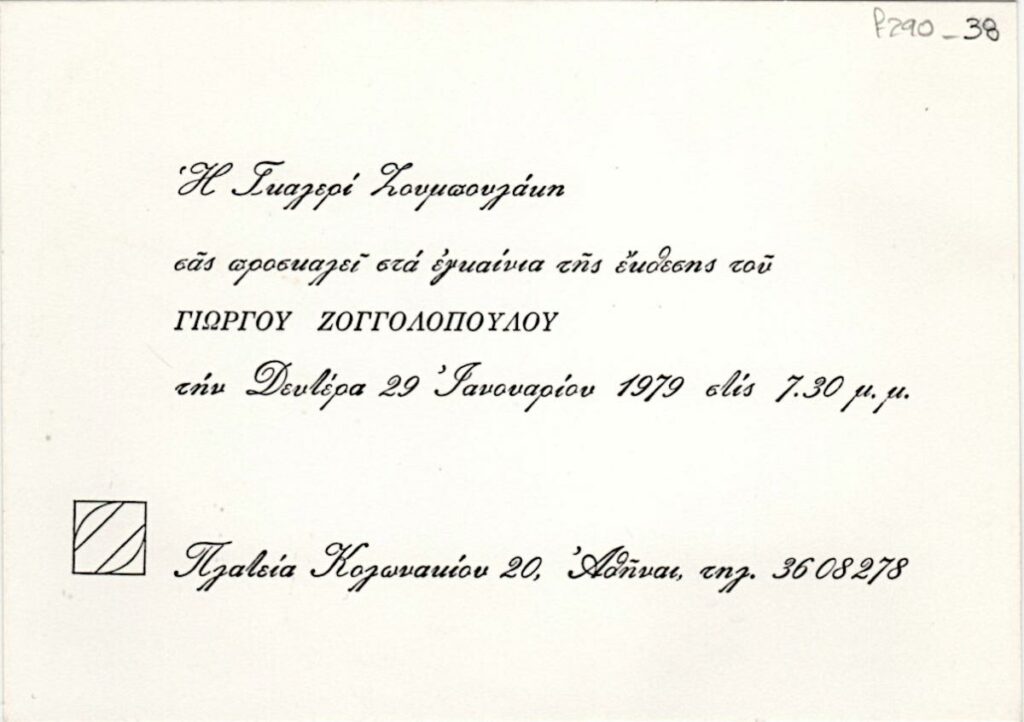 Πρόσκληση στα εγκαίνια της ατομικής έκθεσης του Γιώργου Ζογγολόπουλου στην Αθήνα.