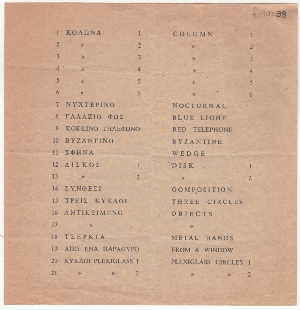 Έντυπο, στα ελληνικά, μονόφυλλο, χαρτί, 17,0×16,5 εκ. Κατάλογος έργων από άγνωστη έκθεση του Γιώργου Ζογγολόπουλου.