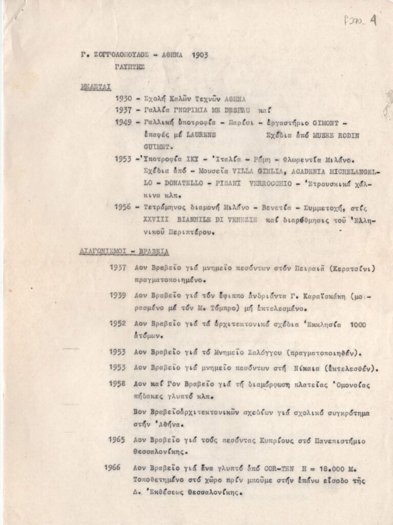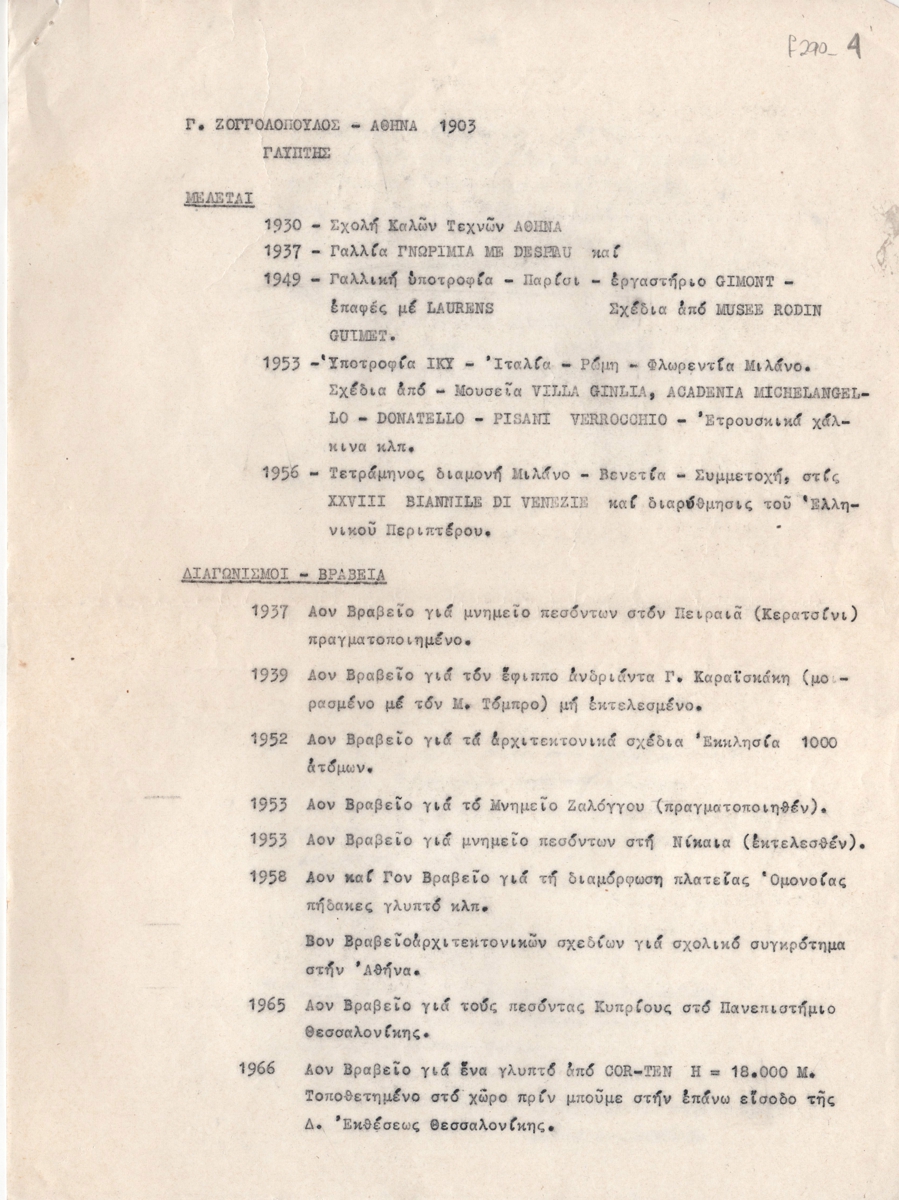 Κείμενο, δακτυλόγραφο, χαρτί, 4 φφ, 29,0×21,5 εκ., στα ελληνικά. Βιογραφικό σημείωμα του Γιώργου Ζογγολόπουλου οργανωμένο χρονολογικά. Αναφέρονται σπουδές, βραβεία σε διαγωνισμούς, συμμετοχές σε ομαδικές εκθέσεις, ατομικές εκθέσεις, έργα που βρίσκονται σε συλλογές, κατάλογος δημοσιευμάτων για το έργο του και δημόσιες θέσεις στην Ελλάδα και το εξωτερικό.