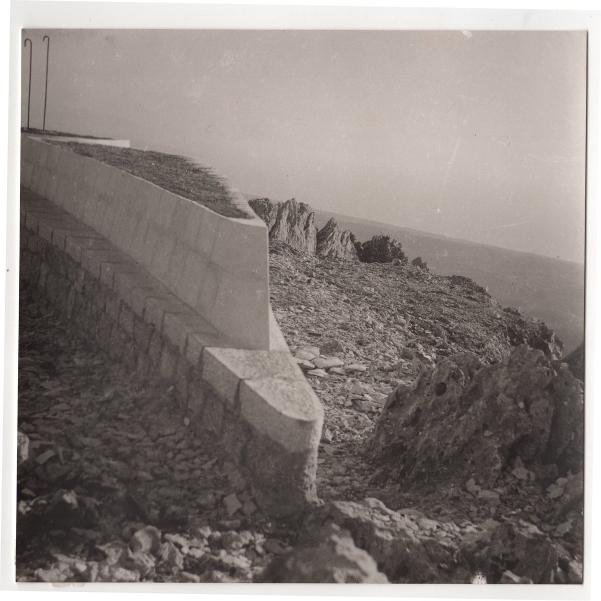 Φωτογραφία τοπίου, α/μ, σε φωτογραφικό χαρτί, 16,5×17,0 εκ. Φωτογραφία τοπίου όπου διακρίνονται πιθανόν οι βάσεις για την τοποθέτηση των μερών του έργου του Γιώργου Ζογγολόπουλου “Μνημείο για τις ηρωίδες του Ζαλλόγου”. Στην πίσω όψη επιγραφή.