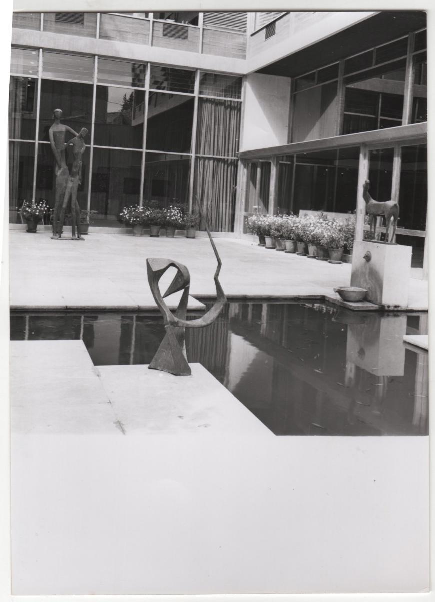Ασπρόμαυρη εκτυπωμένη φωτογραφία εξωτερικού χώρου από έκθεση του Γ. Ζογγολόπουλου στο Ινστιτούτο Δοξιάδη στην Αθήνα. Στην πίσω όψη επιγραφή.