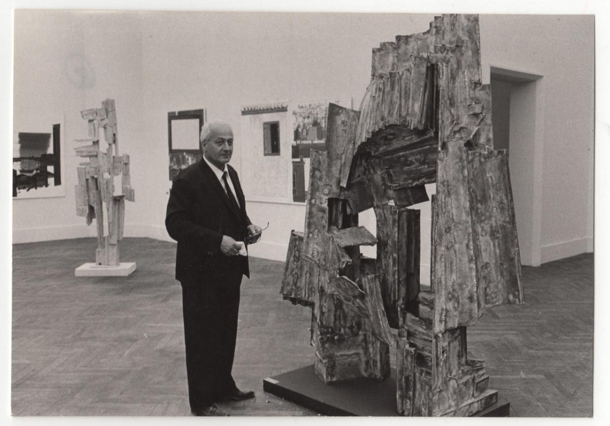 Ασπρόμαυρη εκτυπωμένη φωτογραφία του γλύπτη Γιώργου Ζογγολόπουλου ανάμεσα στα έργα του στο ελληνικό περίπτερο στην Biennale της Βενετίας το 1964. Στην πίσω όψη επιγραφή.