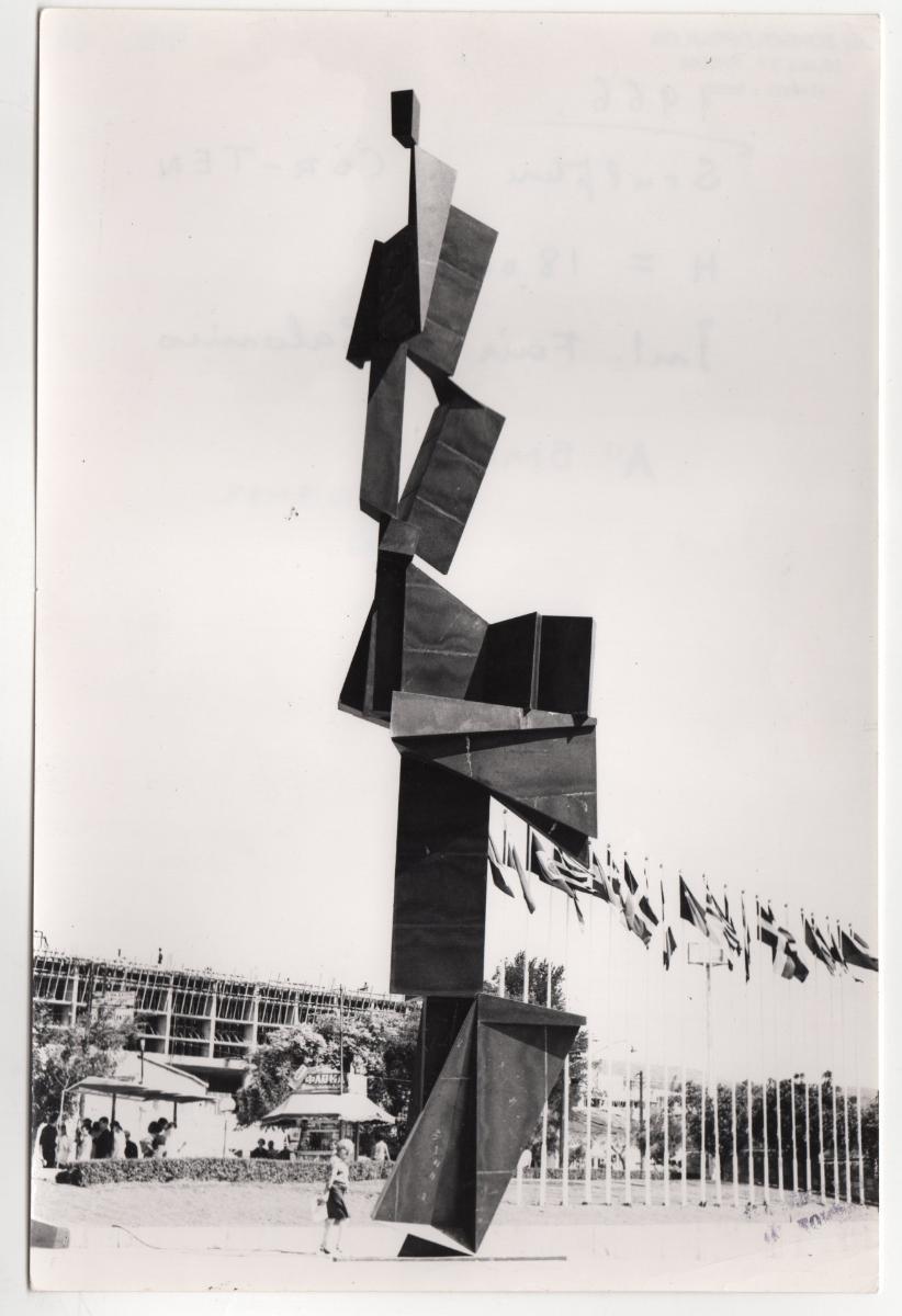 Ασπρόμαυρη εκτυπωμένη φωτογραφία έργου του Γιώργου Ζογγολόπουλου, που είναι τοποθετημένο στην Πλατεία Συντριβανίου μπροστά στην πύλη της Διεθνούς Εκθέσεως Θεσσαλονίκης. Στην πίσω όψη επιγραφή και σφραγίδα καλλιτέχνη.