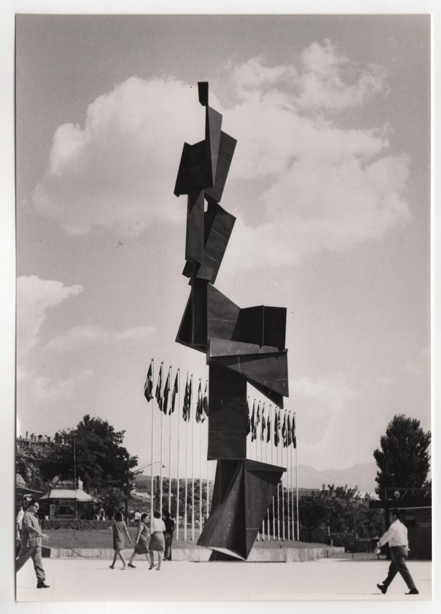 Ασπρόμαυρη εκτυπωμένη φωτογραφία έργου του Γιώργου Ζογγολόπουλου, που είναι τοποθετημένο στην Πλατεία Συντριβανίου μπροστά στην πύλη της Διεθνούς Εκθέσεως Θεσσαλονίκης. Στην πίσω όψη επιγραφή.