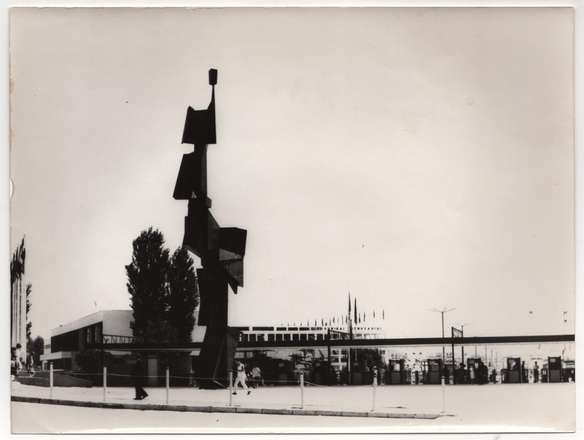 Ασπρόμαυρη εκτυπωμένη φωτογραφία έργου του Γιώργου Ζογγολόπουλου, που είναι τοποθετημένο στην Πλατεία Συντριβανίου μπροστά στην πύλη της Διεθνούς Εκθέσεως Θεσσαλονίκης.