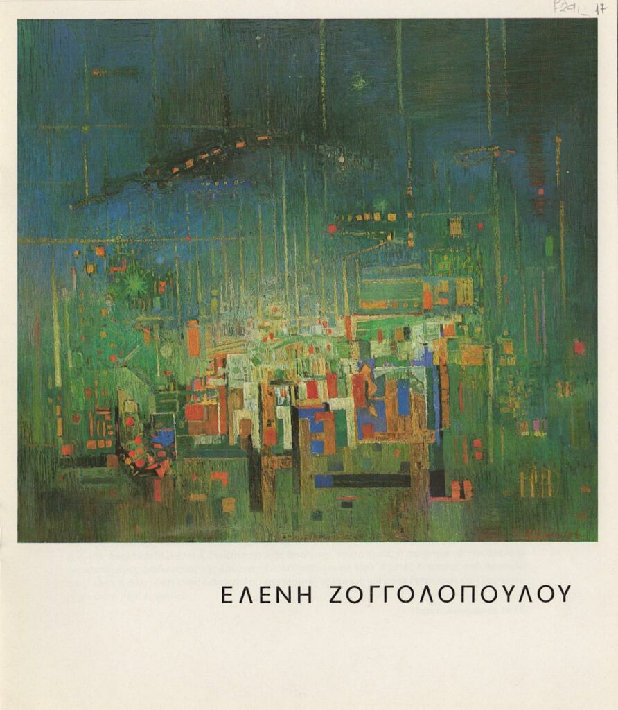 Έντυπο, χαρτί ιλουστρασιόν, τευχίδιο, 8σέλιδο, 22,5×19,5 εκ., στα ελληνικά, ατομικής έκθεσης ζωγραφικής της Ελένης Ζογγολοπούλου, η οποία διεξάγεται στην Αίθουσα Χάρητος στην Αθήνα. Περιέχει κείμενο του Μανώλη Μαυρομάτη με τίτλο “Ταυτότητα και εσωτερική συνέπεια στην εργασία της Ελένης Ζογγολοπούλου”, παλαιότερες κριτικές για την καλλιτέχνιδα για προηγούμενές της εκθέσεις (περίοδος 1964-1966), σε ελληνικά και γαλλικά, βιογραφικό σημείωμα και εικονογράφηση.