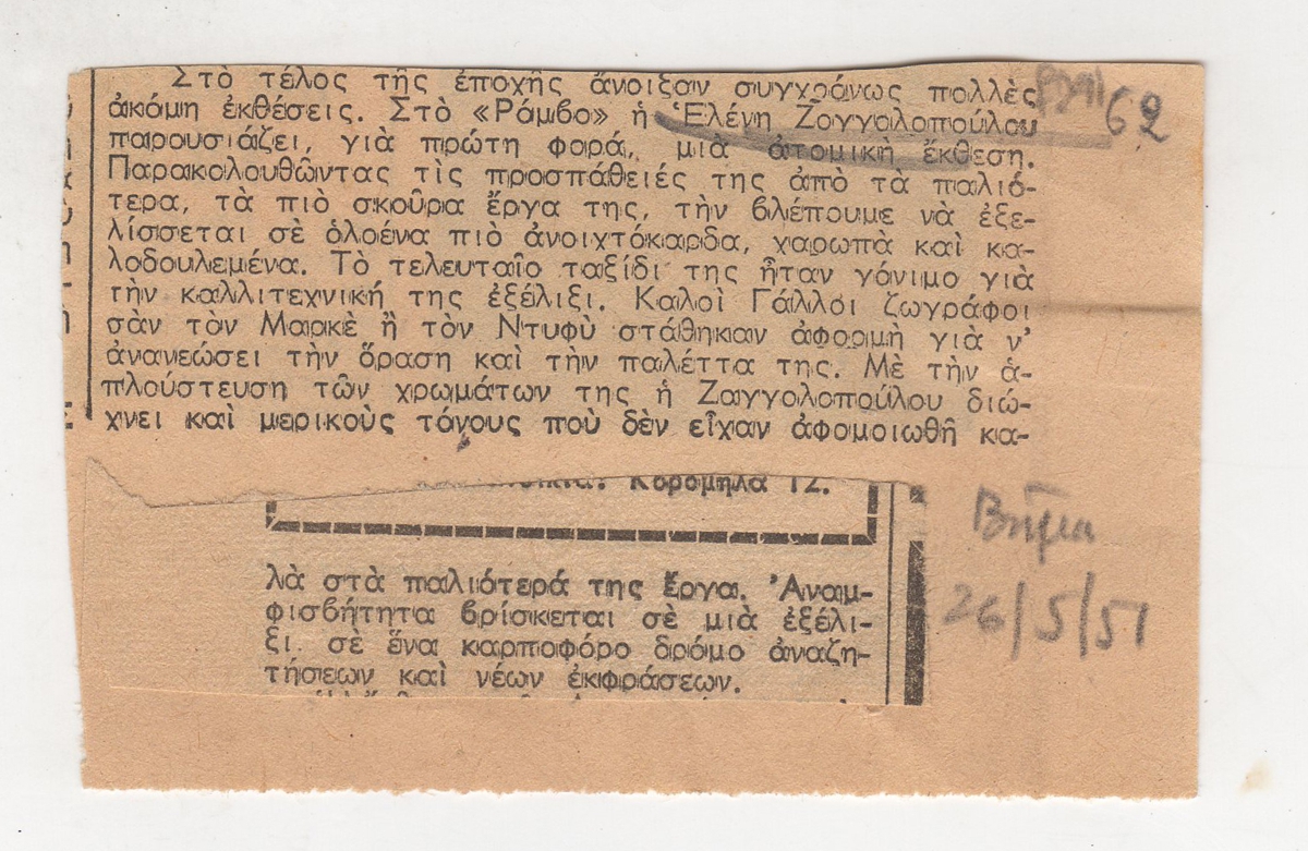 Απόκομμα, χαρτί, 5,5×8,5 εκ., δημοσίευσης κριτικής έκθεσης της Ελένης Ζογγολοπούλου, η οποία διεξάγεται στην Αίθουσα Ρόμβος στην Αθήνα.