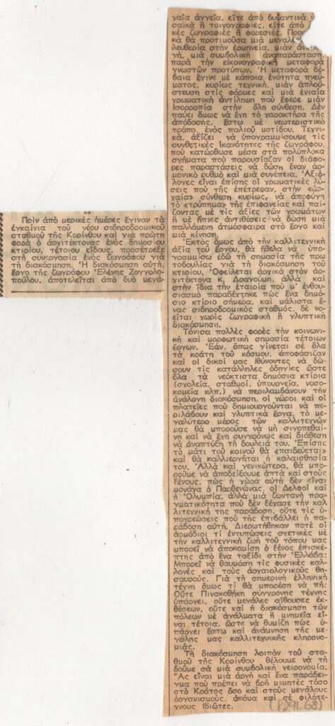 Απόκομμα, χαρτί, 2 φφ, ακανόνιστου μεγέθους, στα ελληνικά, δημοσίευσης άρθρου το οποίο αναφέρεται στηδιακόσμηση του νέου σιδηροδρομικού Ισθμού της Κορίνθου από την Ελένη Ζογγολοπούλου. Εντάσσεται στη στήλη “Καλλιτεχνική Κίνησις” και φέρει επιγραφές.