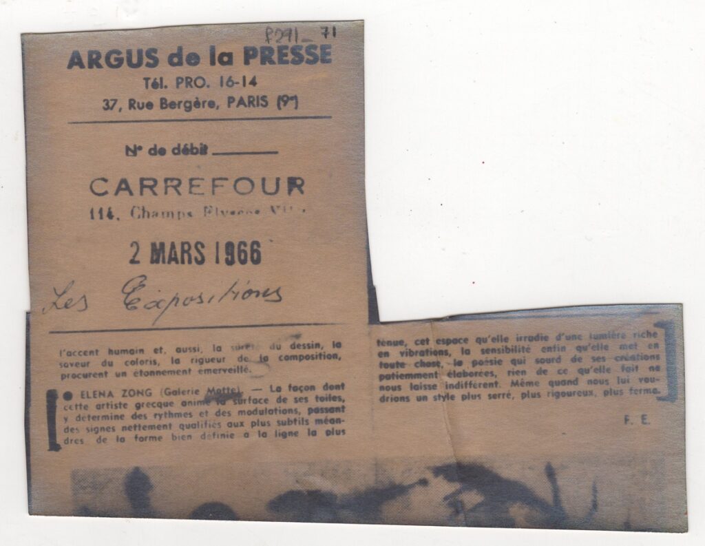 Φωτοαντίγραφο, χαρτί, 10×13,5 εκ., στα γαλλικά, δημοσίευσης κριτικής έκθεσης της Ελένης Ζογγολοπούλου, η οποία διεξάγεται στην Galerie Motte στο Παρίσι. Το απόκομμα φέρει επιγραφές.