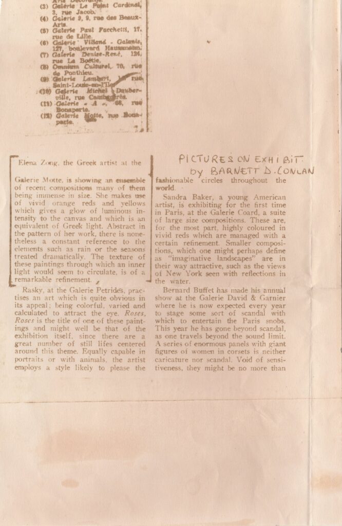 Φωτοαντίγραφο, χαρτί, 23,5×15 εκ., στα αγγλικά, δημοσίευσης κριτικής έκθεσης της Ελένης Ζογγολοπούλου, η οποία διεξάγεται στην γκαλερί Motte στο Παρίσι.