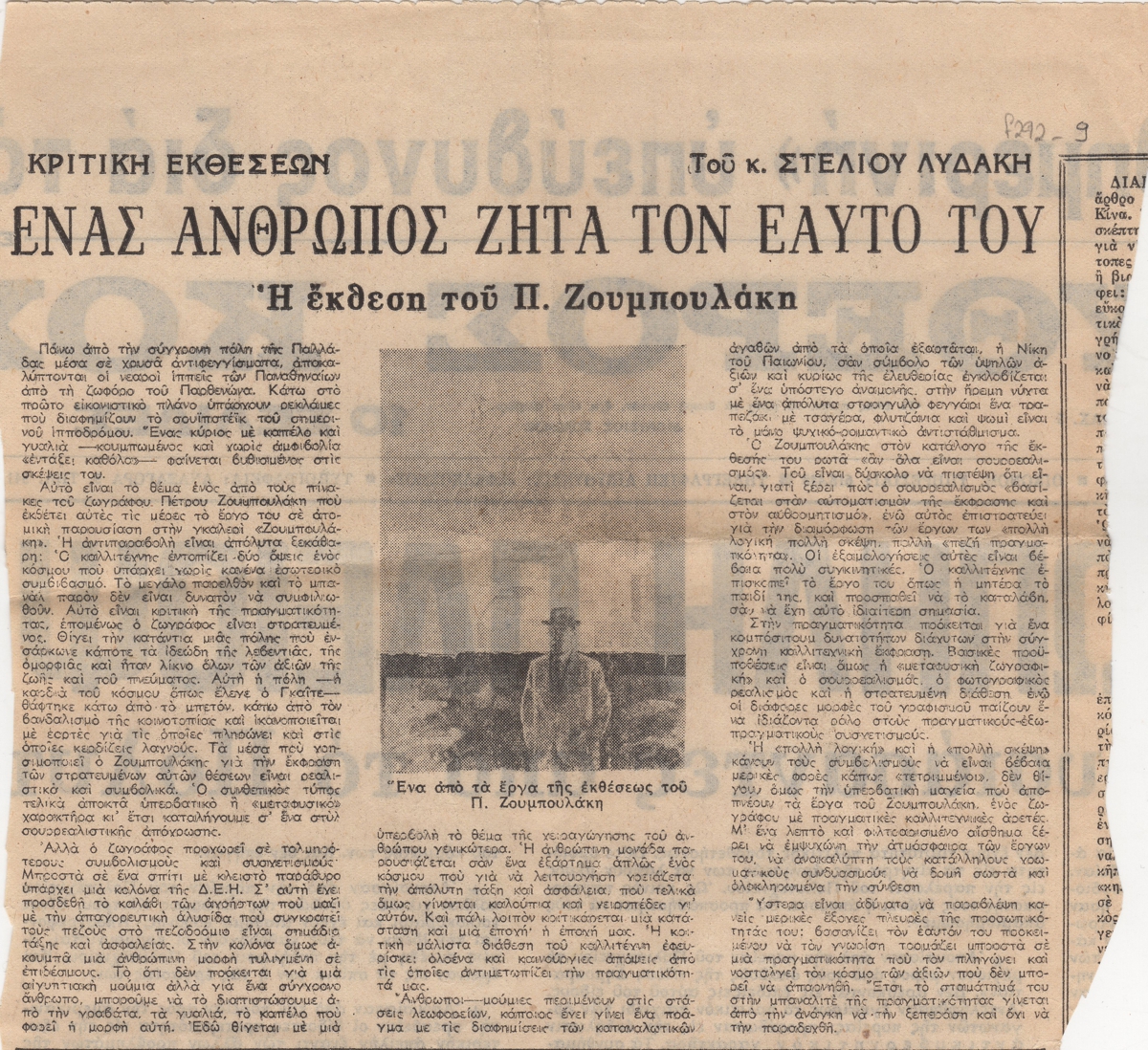 Απόκομμα, χαρτί, 20,5×21,5 εκ., στα ελληνικά, δημοσίευσης κριτικής έκθεσης του Πέτρου Ζουμπουλάκη, η οποία διεξάγεται στην γκαλερί Ζουμπουλάκη.