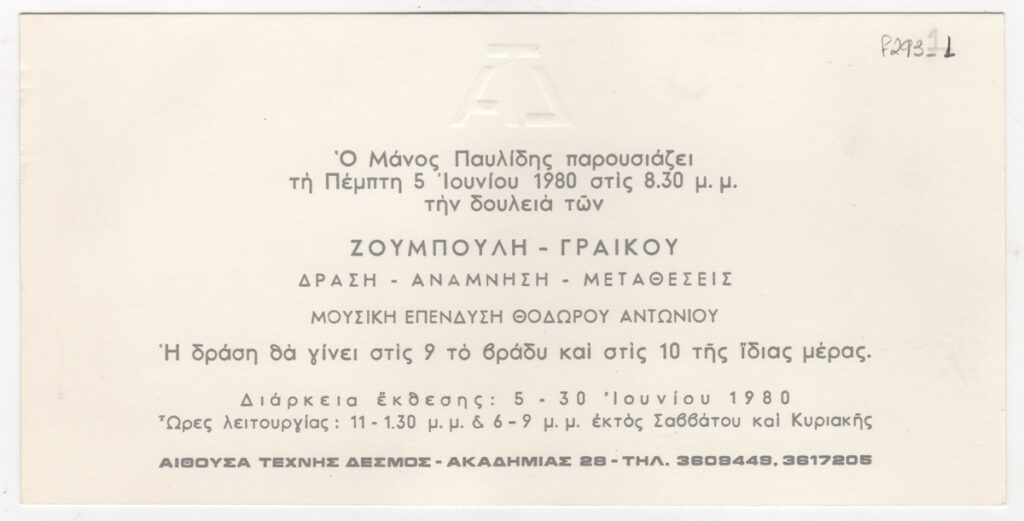 Πρόσκληση, χαρτόνι, 10×20 εκ., στα ελληνικά, ομαδικής έκθεσης των Νίκου Ζουμπούλη και Τίτσας Γραικού στην Αίθουσα Τέχνης Δεσμός, στην Αθήνα το 1980.
