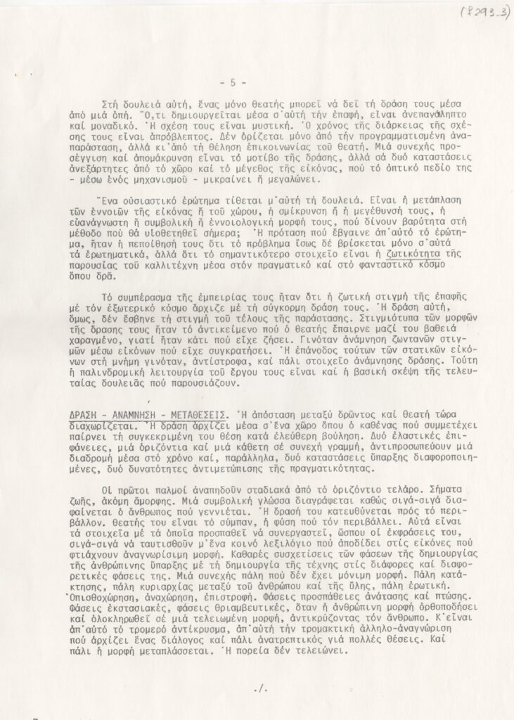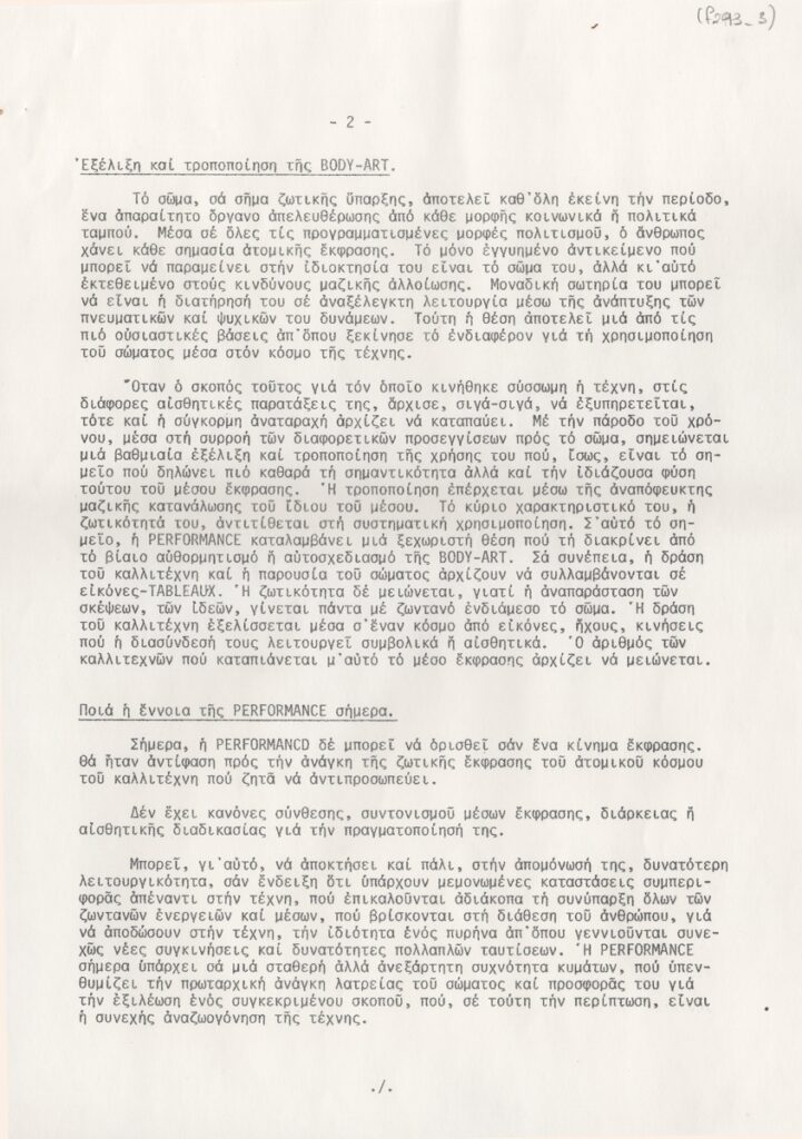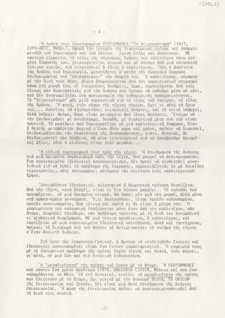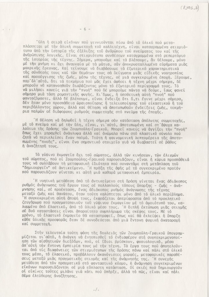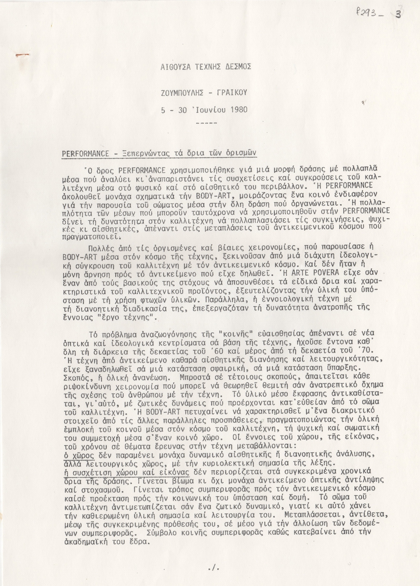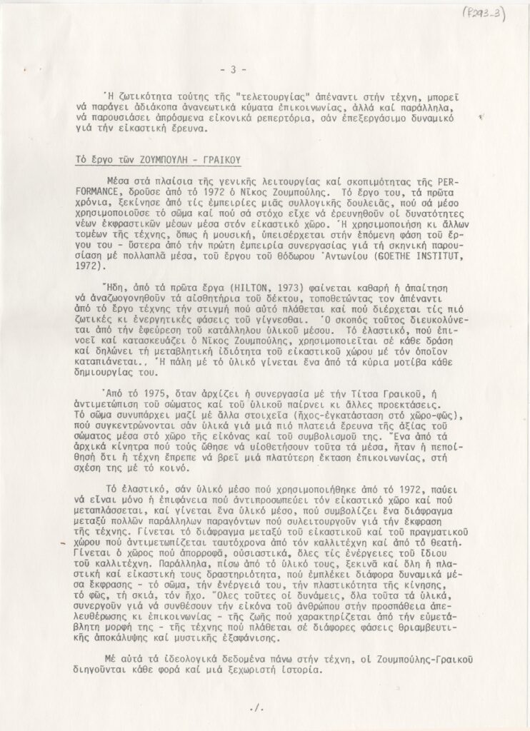 Έντυπο, χαρτί, 7 φφ, 29,5×21 εκ., στα ελληνικά, ομαδικής έκθεσης των Νίκου Ζουμπούλη και Τίτσας Γραικού, στην Αίθουσα Τέχνης Δεσμός στην Αθήνα το 1980. Αναγράφεται κείμενο της Έφης Στρούζα, αναφερόμενο στο έργο των καλλιτεχνών και στην έννοια της “Performance”.