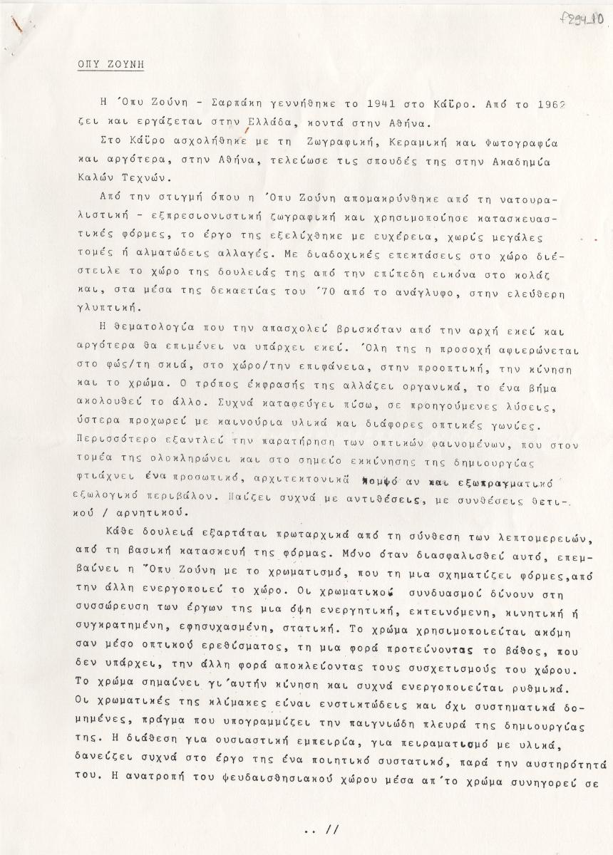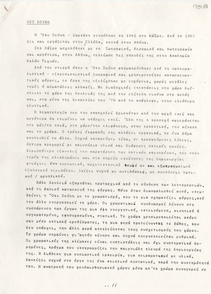 Δακτυλόγραφο κείμενο για την Όπυ Ζούνη. Γίνεται λόγος για το έργο της, ενώ δίνονται βιογραφικές πληροφορίες.
