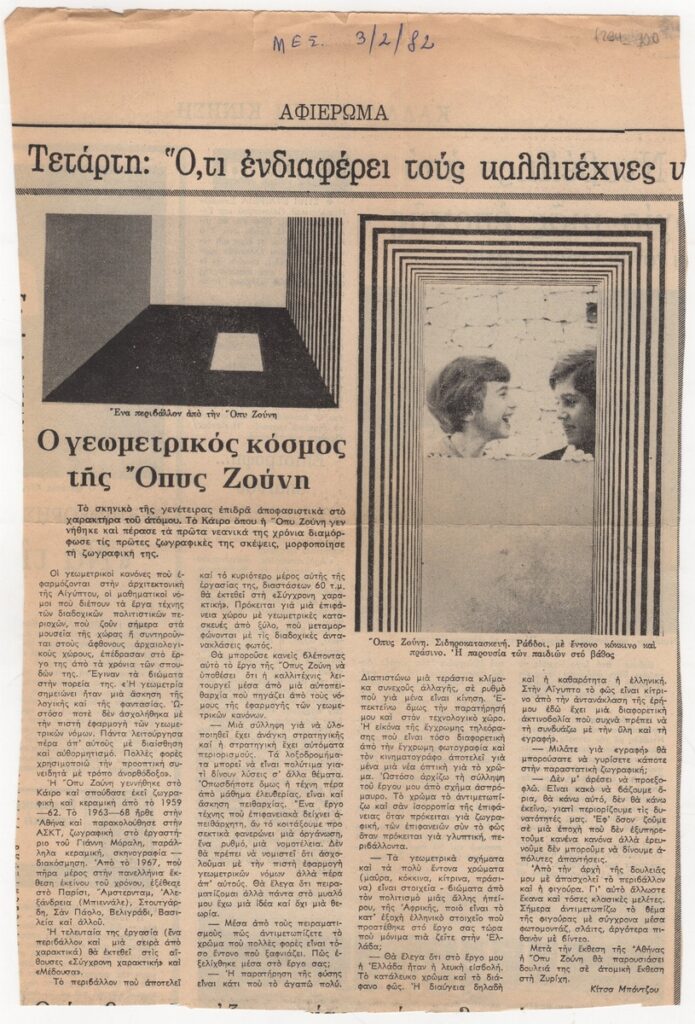 Απόκομμα της εφημερίδας “Μεσημβρινή” (03/02/1982) δημοσίευσης άρθρου για το έργο της Όπυς Ζούνη. Γίνεται ιδιαίτερος λόγος για τη γεωμετρία των έργων της, ενώ δίνονται και αποσπάσματα απόψεών της.
