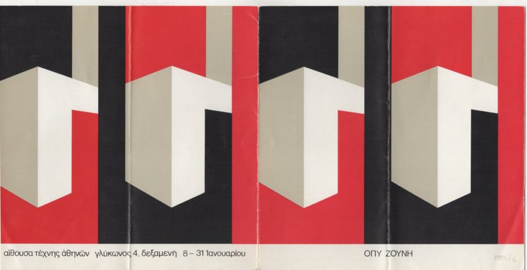 Έντυπο ατομικής έκθεσης της Όπυς Ζούνη, η οποία διεξάγεται στην Αίθουσα Τέχνης Αθηνών. Περιέχει βιογραφικό της καλλιτέχνιδας, κείμενο του Δημήτρη Φατούρου, με τίτλο “Σύντομο βοήθημα για το έργο της Όπυς Ζούνη”, σύντομο απόσπασμα κειμένου της καλλιτέχνιδας για το έργο της και απόφθεγμα του Νίτσε για τον “Ρεαλιστή Ζωγράφο”.