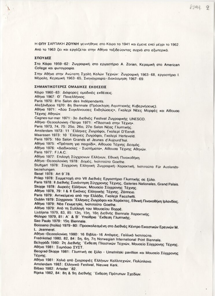 Βιογραφικό, χαρτί, 2 φφ, 29,5×21 εκ., στα ελληνικά, της Όπυς Ζούνη. Περιέχει σπουδές, λίστα σημαντικότερων ομαδικών και ατομικών εκθέσεων και μέρη όπου βρίσκονται έργα της.