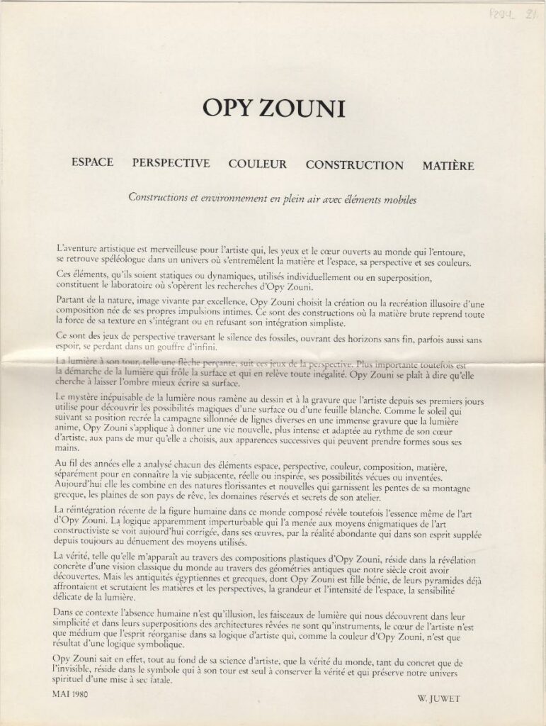Έντυπο με κείμενο με τίτλο “Contructions et environnement en plein air avec éléments mobiles”, αναφερόμενο στο εικαστικό έργο της Όπυς Ζούνη. Περιέχει βιογραφικό σημείωμα και εικονογράφηση.