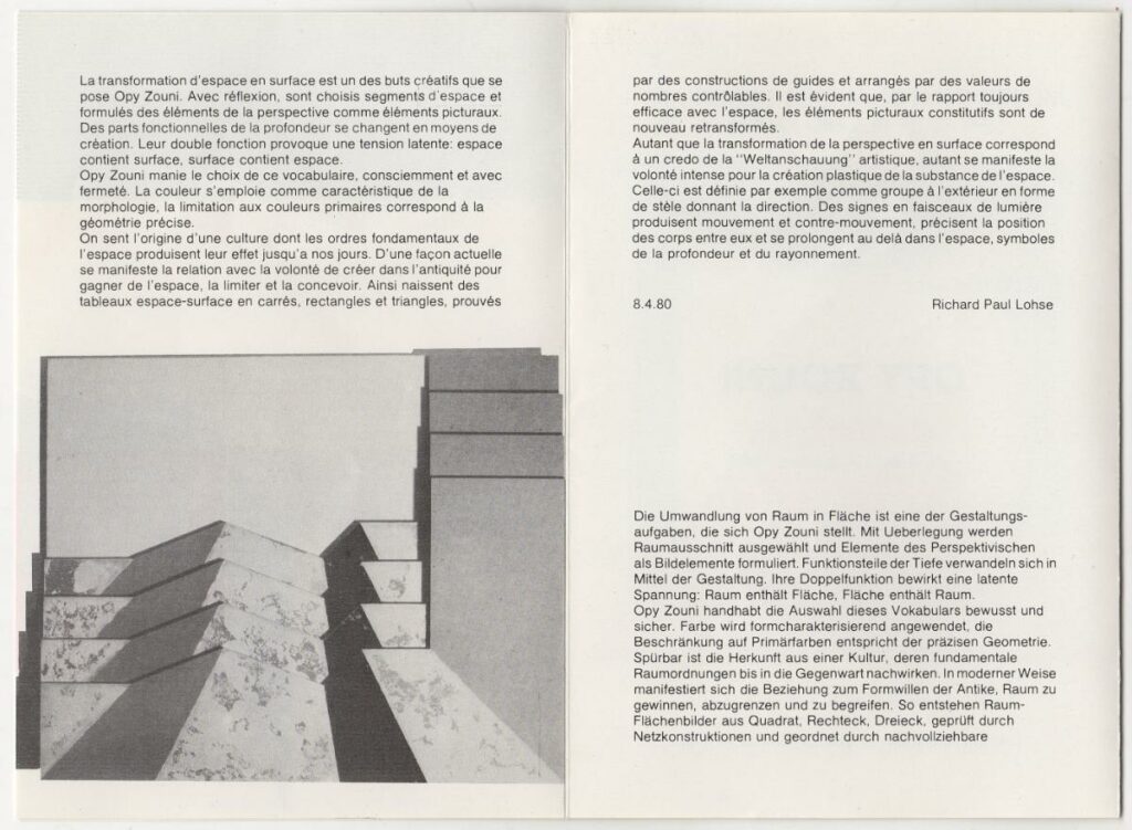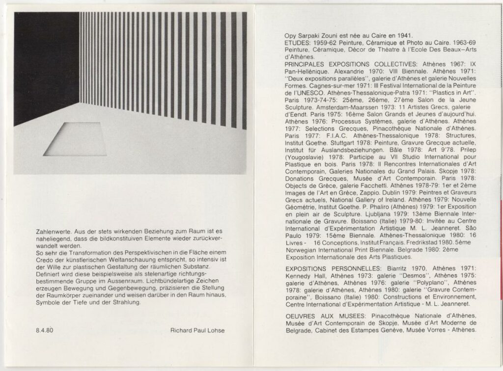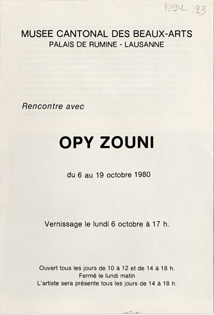Έντυπο ατομικής έκθεσης της Όπυς Ζούνη, στη Λωζάνη. Το έντυπο περιέχει κριτική του Richard Paul Lohse για το έργο της καλλιτέχνιδας, βιογραφικό της και εικονογράφηση.